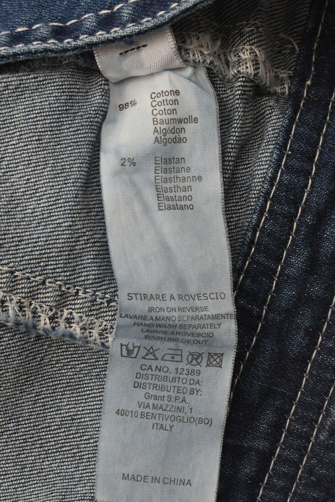 Stretch Blue Aged look denim, Biker Styled zip front. Rhinestone trim.